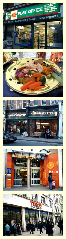 | | 自炊生活を上手にやりくりする場合、安く売られているスーパーやストリート・マーケットなどで購入するようにしましょう。例えば、スーパーでは「テスコ(TESCO)」や「センズベリー(Sainsbury's)」、ストリート・マーケットでは「シェパーズ・ブッシュ(Shepherd's Bush)」や「スミスフィールド(Smithfield)」で安くて美味しい食材を揃えることができます。ロンドンの大手スーパーは24時間営業の店もありとても便利です。 |